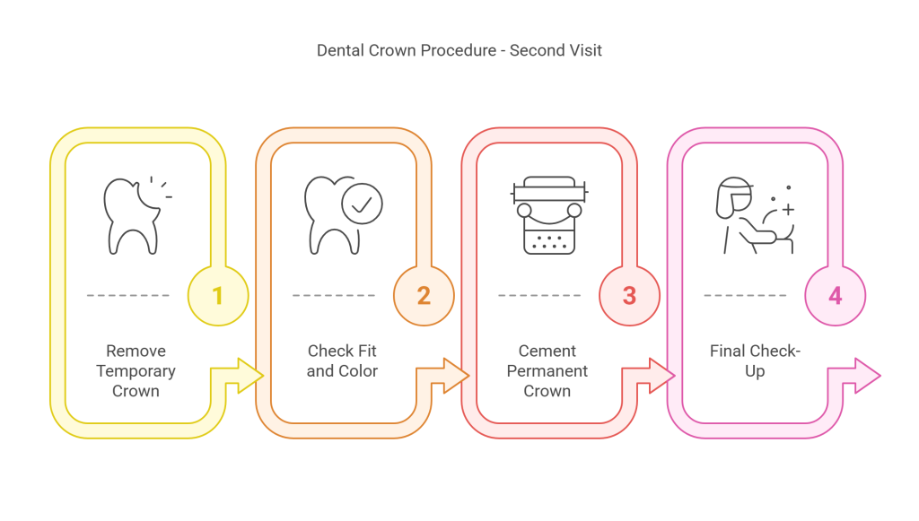 – During this first office visit, your dentist will make a temporary crown to cover and protect the prepared tooth while you’re waiting on the permanent crown.